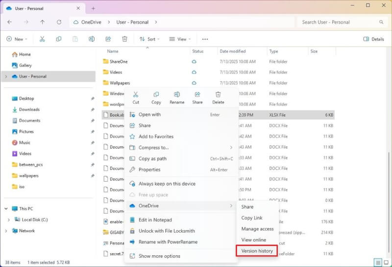 Bên cạnh khôi phục toàn bộ, OneDrive còn lưu trữ lịch sử phiên bản riêng cho từng file. Điều này cực kỳ hữu ích khi bạn cần quay lại phiên bản cũ của một tài liệu Word, Excel hay PowerPoint mà không muốn khôi phục toàn bộ thư mục.