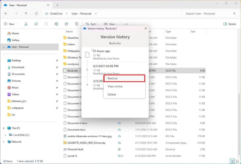 Từ File Explorer, chọn file → chuột phải → OneDrive → Version history → chọn phiên bản mong muốn → Restore. Bạn thậm chí có thể xem trước nội dung để đảm bảo khôi phục đúng tệp mình cần.