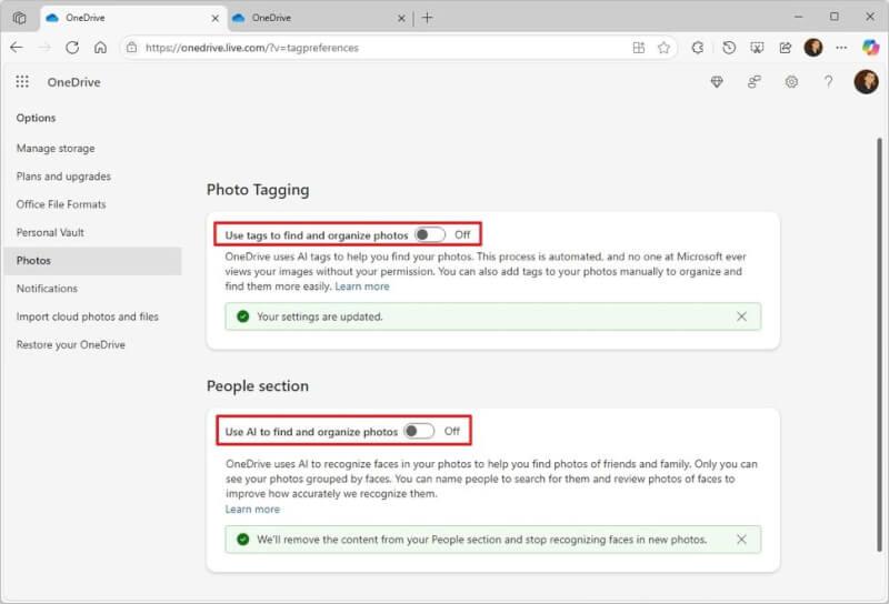 Trên OneDrive web, truy cập Settings → Options → Photos → tắt hai tùy chọn “Use tags to find and organize photos” và “Use AI to find and organize photos”.