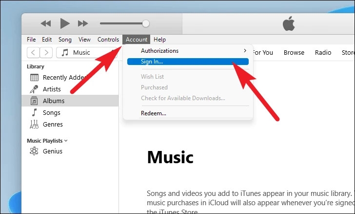 Bước 1: Mở iTunes → chọn Account → Sign In…