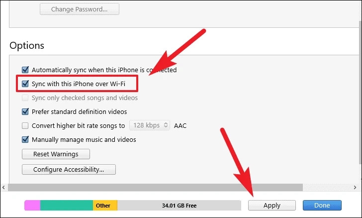 Bước 2: Cuộn xuống mục Options → tick chọn Sync with this iPhone over Wi-Fi → chọn Apply.