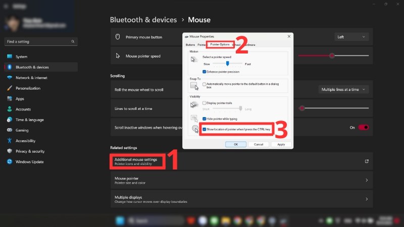 Mẹo nhỏ: Sau khi bật tùy chọn này, mỗi khi mất con trỏ, bạn chỉ cần nhấn phím Ctrl, vị trí con trỏ sẽ hiển thị bằng vòng tròn sáng dễ nhận biết.