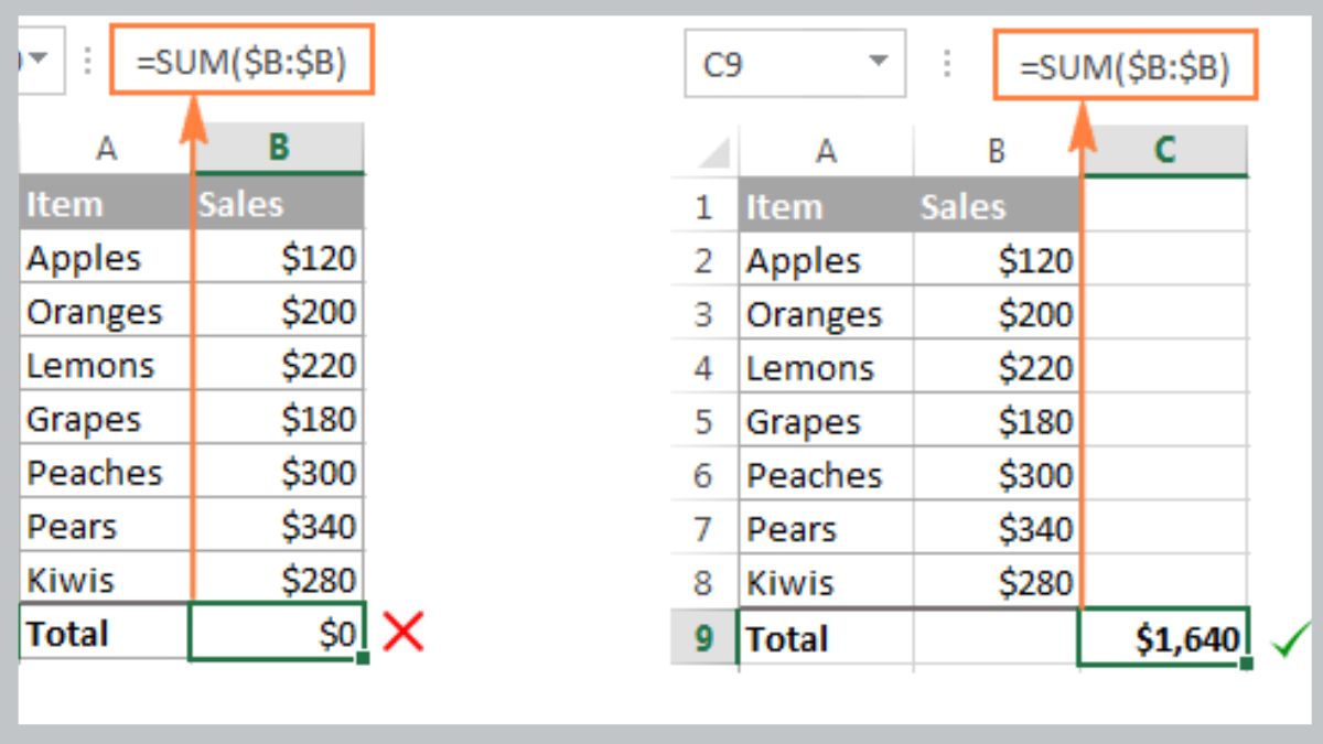 Kiểm tra lại vùng tham chiếu trong công thức SUM