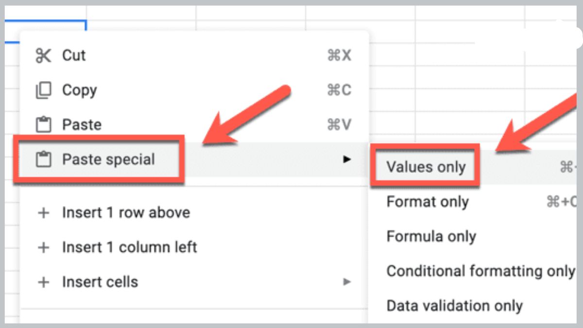 Dán dữ liệu vào Google Sheet bằng tùy chọn: Chuột phải → Dán đặc biệt (Paste special) → Chỉ giá trị (Values only).