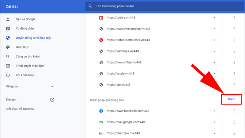 Bước 5: Tại khu vực Được phép gửi thông báo (Allowed to send notifications), bạn nhấn nút Thêm (Add).