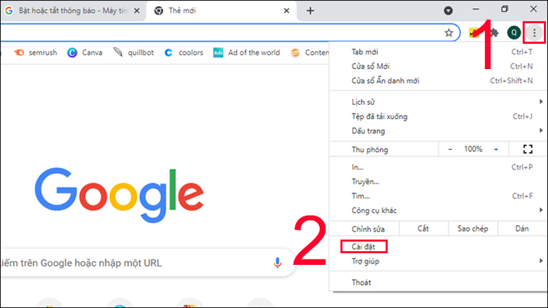 Bước 1: Khởi chạy trình duyệt Google Chrome. Tại giao diện chính, click vào biểu tượng dấu 3 chấm dọc (Menu) ở góc trên bên phải màn hình, chọn Cài đặt (Setting).