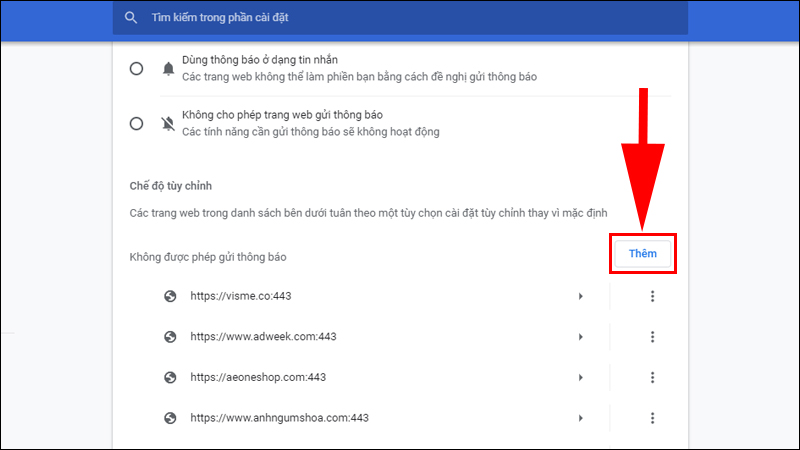 Bước 5: Tại khu vực Không được phép gửi thông báo (Not allowed to send notifications), bạn nhấn nút Thêm (Add).
