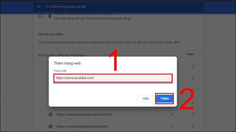 Bước 6: Một hộp thoại sẽ hiện ra. Bạn hãy Sao chép (Copy) đường dẫn URL của trang web muốn chặn (Ví dụ: youtube.com, facebook.com) và Dán (Paste) vào ô trống. Cuối cùng nhấn Thêm (Add) để hoàn tất.