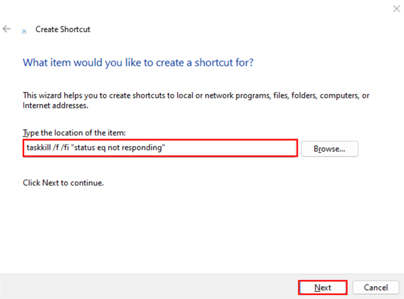 Bước 3: Trong ô Type the location of the item, nhập lệnh: