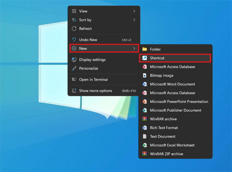 Bước 2: Nhấp chuột phải → chọn New > Shortcut.
