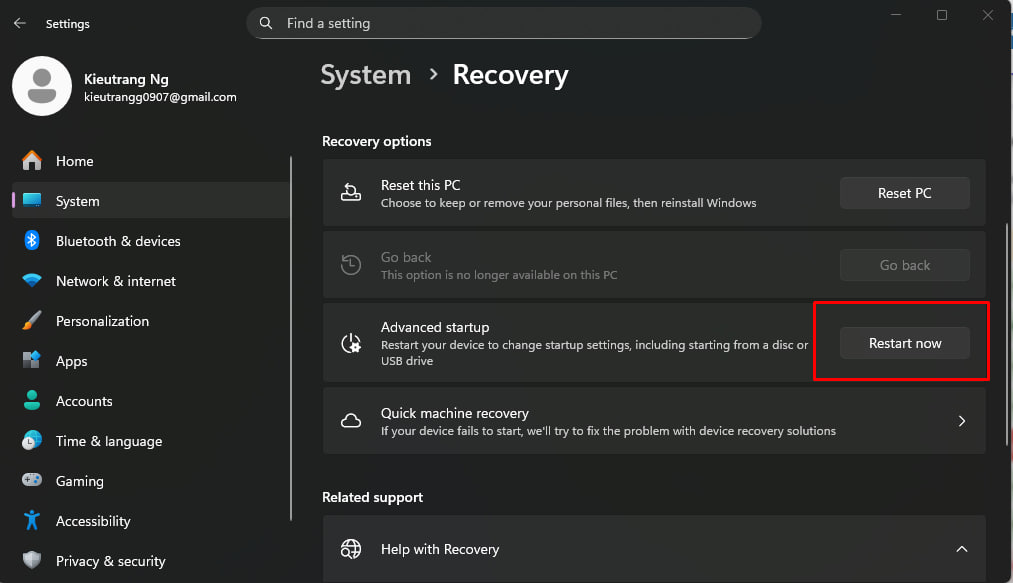 Tại mục Advanced startup, nhấn nút Restart now.