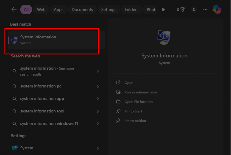 Bước 1: Nhấn tổ hợp phím Windows + S, gõ từ khóa System Information và nhấn Enter.