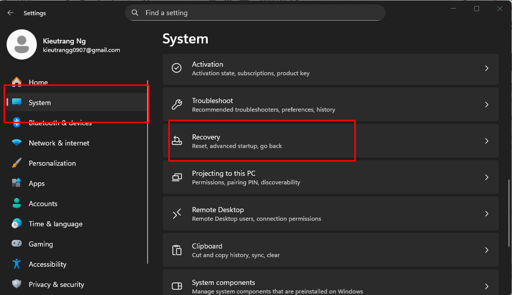 Vào Settings > System > Recovery.