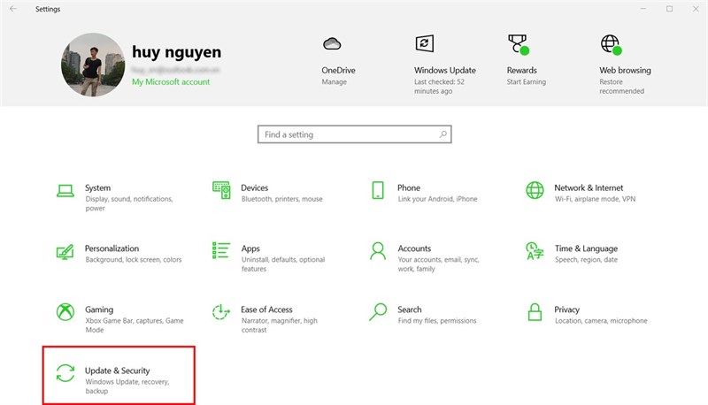 Bước 1: Mở Settings (Cài đặt) → Chọn Update & Security → Chọn Windows Update.