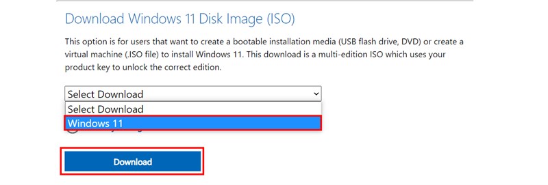 Bước 3: Chọn phiên bản Windows 11 phù hợp → Nhấn Download → Làm theo hướng dẫn để ghi file ISO vào USB hoặc ổ cứng ngoài.