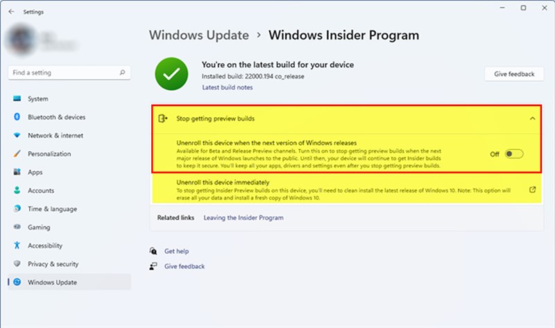 Bước 3: Bật tùy chọn Unenroll this device when the next version of Windows releases.