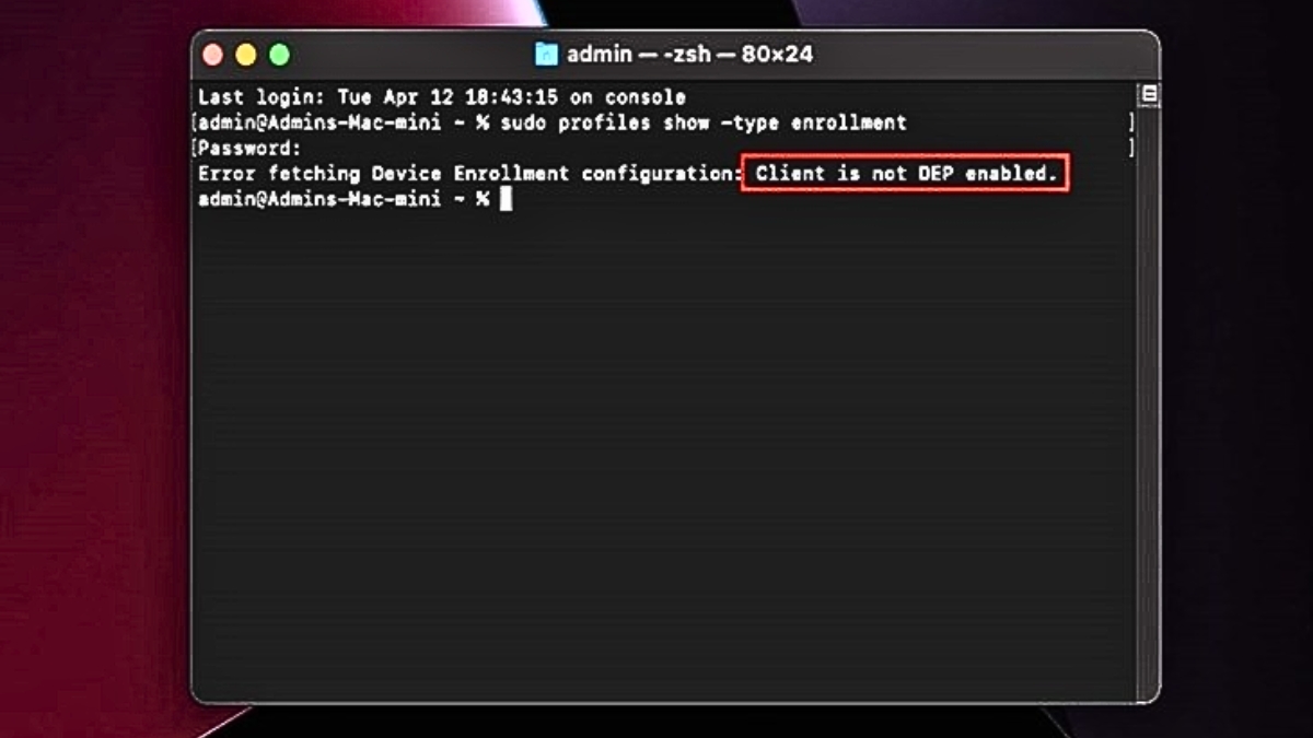 Bước 3: Nếu kết quả trả về dòng chữ “Enrolled via DEP: Yes” hoặc có tên tổ chức, máy đó chắc chắn có MDM. Nếu kết quả hiển thị là Client is not DEP enabled thì máy đó không có MDM.